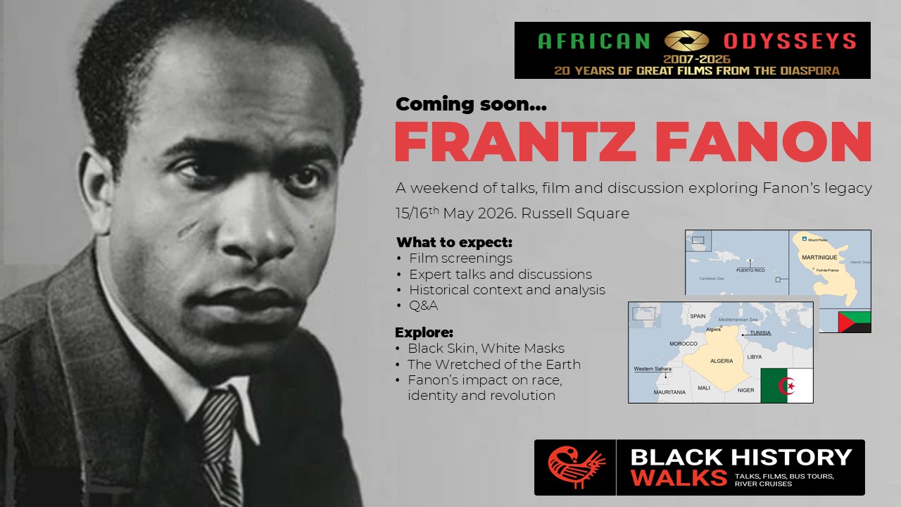Our Black history walks and tours link directly to films as people often want more information after doing a walk .2026 marks 20 years of our monthly African Odysseys film shows. Previously at the BFI Southbank it moved due to their racism and now rotates shows across London. To add your name to the 17,455 strong petition to support it, click HERE . Read our book ‘Black History Walks in London Volume 1′ for a brief history of Black film exhibition HERE